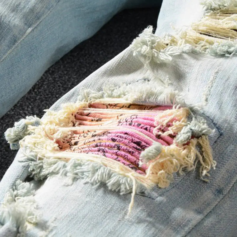 Destaca entre la multitud con los jeans rasgados con parche rosa. Estos elegantes jeans combinan atrevidos detalles rasgados con divertidos parches rosas, creando una apariencia única y llamativa que es perfecta para expresar tu individualidad.