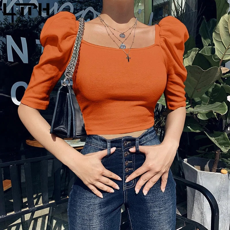 Designed with a chic square neckline and eye-catching puff sleeves, this blouse exudes sophistication and charm. The short dew navel design adds a hint of allure, perfect for those moments when you want to stand out from the crowd.